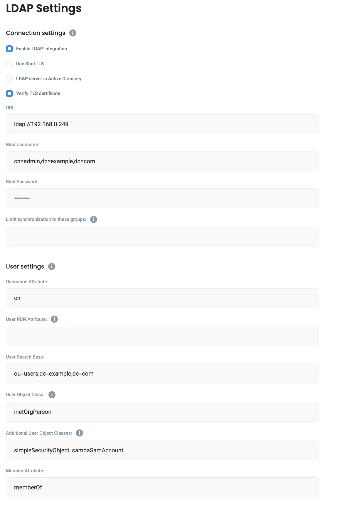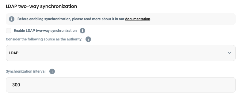 Make sure you selected "Enable LDAP integration" as without it, the two-way synchronization won't work. After you fill out all the fields, test your configuration using the <img src="https://3466771104-files.gitbook.io/~/files/v0/b/gitbook-x-prod.appspot.com/o/spaces%2Fe86iamwJVSYnIRsyVEAV%2Fuploads%2Fgit-blob-58e63669cee3c276f7b05609518a56f1ad7b530c%2Fimage.png?alt=media" alt="" data-size="line"> button.