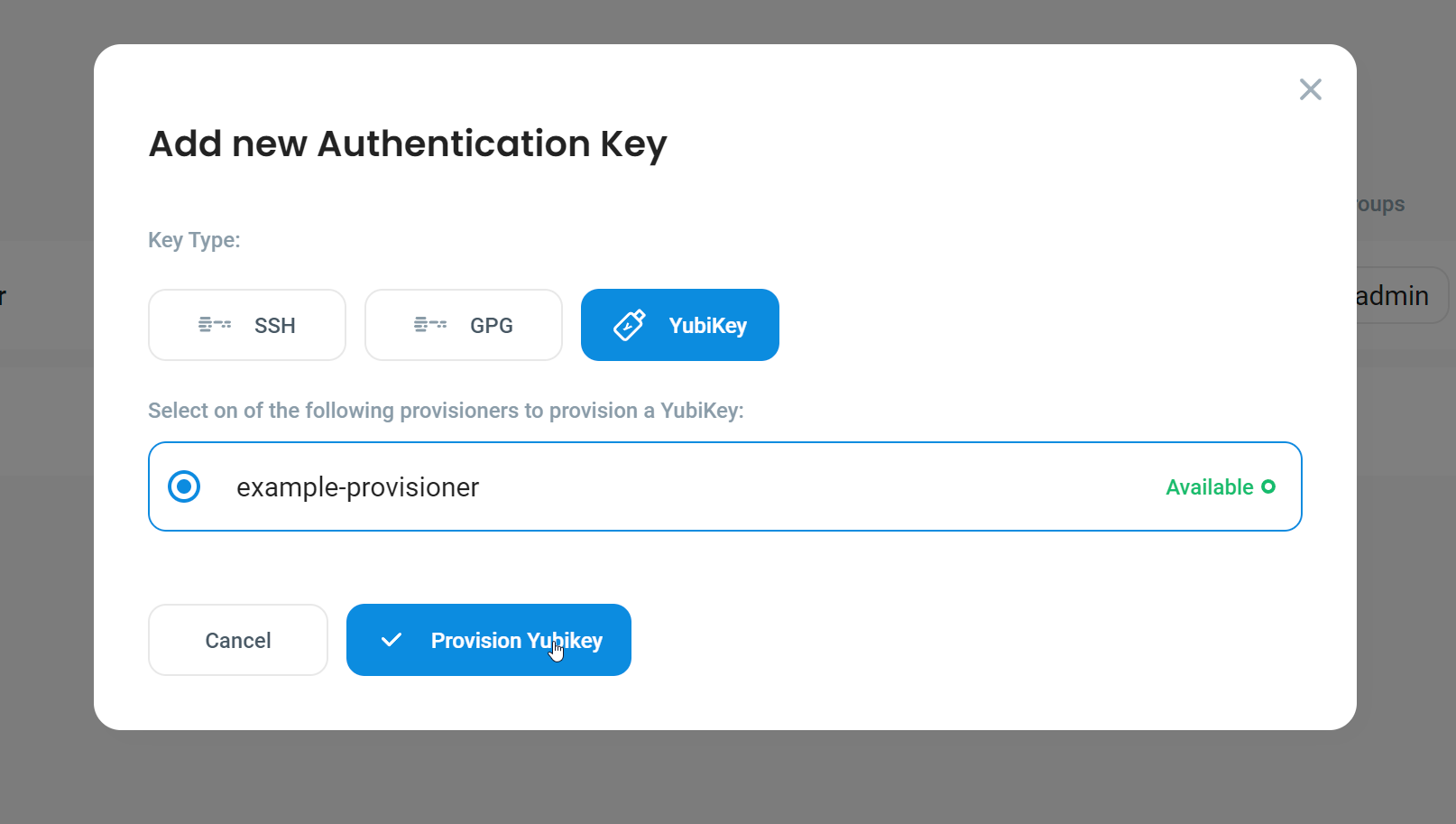 This path describes how the admin can provision a key for a user, but the same provisioning modal is also available to the users on the user profile if any workers are available on the instance.