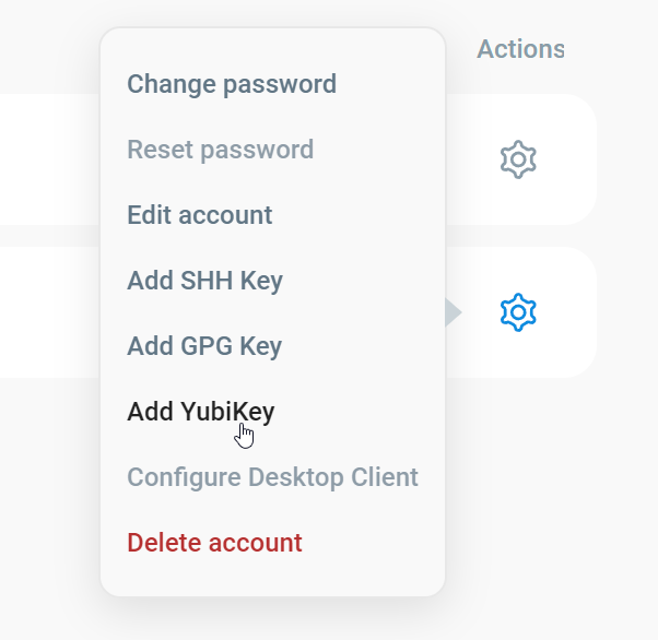 3. Select "Add YubiKey" from the actions menu for a User in the list.