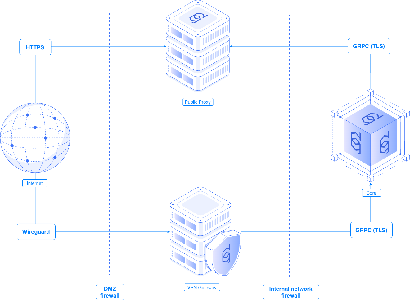 * All internal API traffic uses gRPC (recommended over TLS).